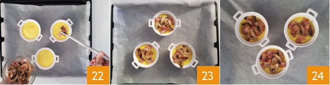 Now distribute the mixture into oven-proof cocottes 19, place them on a baking sheet 20 and bake in a preheated ventilated oven at 300°F for 20 minutes on the middle shelf. After this time, remove the cocottes 21