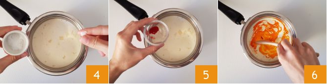 Add a pinch of salt 4, the saffron powder 5, and stir with a spoon 6.