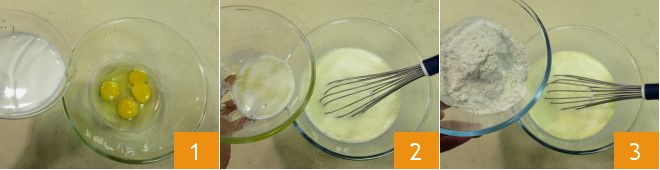 To prepare the crepes with chanterelles and bacon, start by melting the butter over very low heat. Allow to cool slightly, then add the milk to the eggs 1, beat with a whisk and pour in the cooled melted butter 2. Add the flour 3