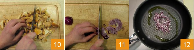 Move on to preparing the mushrooms: you can clean them with a dry or slightly damp cloth, then chop them with a knife 10. Cut the bacon into cubes, clean and chop the onion as well 11. Pour a drizzle of oil into a pan and sauté the onion for a few minutes 12 over low heat, stirring occasionally until it softens.