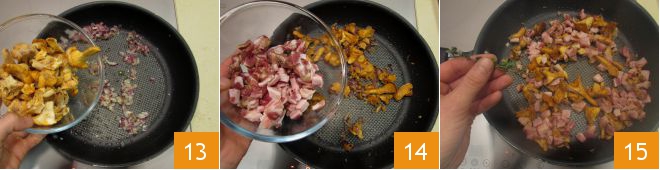 Add the mushrooms 13. Stir and also add the diced bacon 14, the thyme leaves 15, and salt and pepper to taste. Cook for about 5-6 minutes: the bacon should be crispy and the mushrooms soft.
