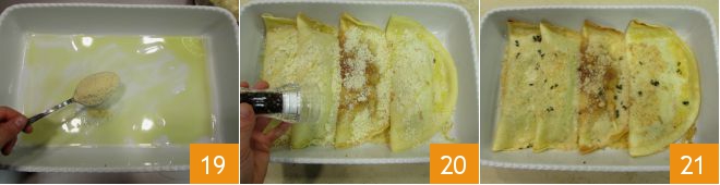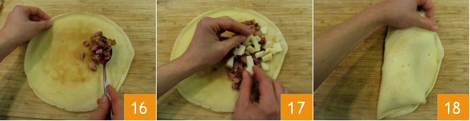Once ready, slightly cool the filling and fill the crepes: place mushrooms and bacon on one half 16, add the cubed fontina cheese 17, then fold into a half-moon 18.