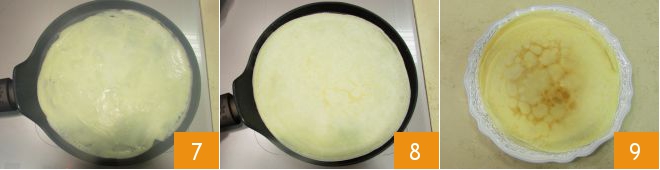spread it evenly with the appropriate crepe spreading spatula or by rotating the pan 7. Cook for a couple of minutes, just until the base is golden, then gently flip the crepe and cook the other side 8. As they are ready, stack the crepes on a serving plate 9, then set them aside covered with plastic wrap.
