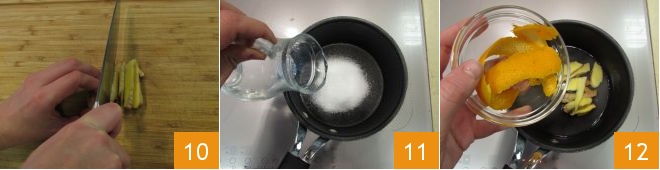 Meanwhile, prepare the syrup for the spritz by first slicing the ginger thinly 10. In a small saucepan, pour the sugar and water 11, add the ginger, and the peeled orange zest 12,