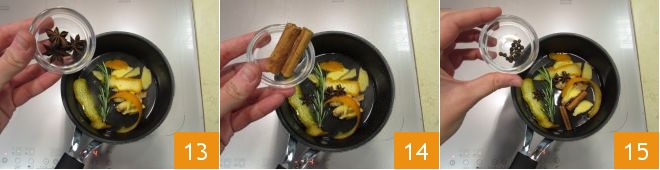 the star anise 13, cinnamon sticks 14, rosemary, and finally the peppercorns 14.