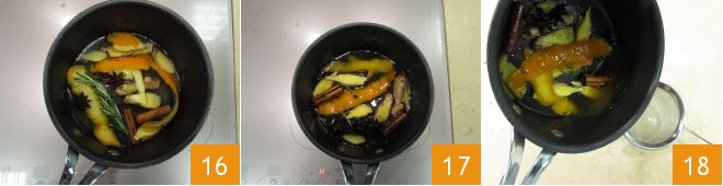Bring to just below a boil 16 and let it simmer very gently for about half an hour 17. Once done, let it cool, then strain the syrup 18 but keep the candied orange peels, cinnamon, and a few ginger slices for garnishing the glasses.