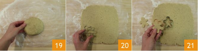 Retrieve the firmed-up dough and place it on a lightly floured surface 19; roll it out with a rolling pin on a lightly floured board to a thickness of about 1/5 inch. Use a gingerbread man cutter to shape your gingerbread cookies (20-21)