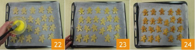 and arrange them on a baking sheet lined with parchment paper. Brush with beaten egg yolk mixed with a little milk (22-23) and bake in a static oven at 392°F on the middle-lower rack for about 15 minutes. Once out of the oven, the cookies will be golden but soft: let them cool completely before moving them 34.