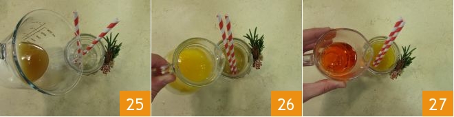 For the spritz, distribute the syrup into 4 glasses (with ice if desired) 25 and in each, add 1/4 cup of orange juice 26, 1/4 cup of Aperol 27,