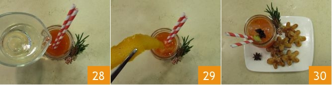 1/3 cup of Prosecco 28 and stir. Finish with the orange, ginger, and candied cinnamon you set aside 29 and serve your holiday spritz immediately, accompanied by the savory gingerbread 30.