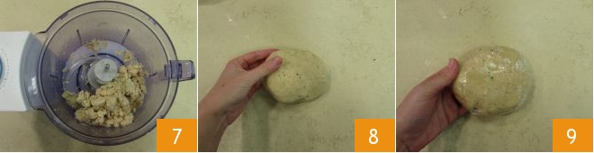 Pulse again until the dough comes together without overheating 7. Transfer it to the work surface, shape it into a flat disk 8, wrap it in plastic wrap 9, and refrigerate for half an hour to firm up.