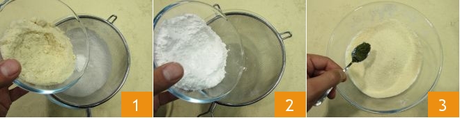 To prepare the savory macarons with salmon and dill, start by making the macarons. Sift the almond flour 1 and powdered sugar 2 into a bowl. Also, add the salt and dried dill 3 to the bowl.
