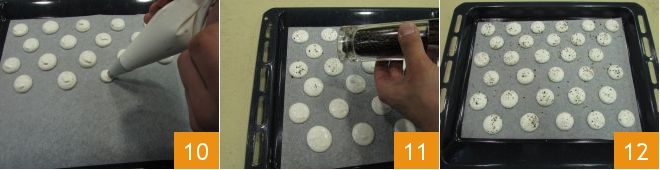 Transfer the mixture into a piping bag with a 1/2-inch plain nozzle. On a baking tray lined with parchment paper, pipe small discs of batter with a diameter of about 1 1/4 inches 10, spaced at least 1 inch apart: with our quantities, you will make about 60. Then, take the tray with both hands and gently tap it on the work surface (or lightly tap the bottom of the tray) to slightly flatten the macarons. Then sprinkle the discs with ground black pepper 11 and let them dry for at least 20 minutes at room temperature. Then bake in a preheated ventilated oven at 293°F for 25-30 minutes (it is not recommended to use a static oven mode). Remove from the oven and let cool 12.