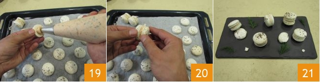 Finally, transfer the salmon mousse into a piping bag, take a disc, and fill it with mousse until the entire flat surface is covered 19; close with another disc, applying slight pressure with your fingers so that the two ends adhere to the mousse, remaining united 20. Continue until you have used all the ingredients, and you will get 30 macarons. Your savory macarons with salmon and dill are ready to be served 21!