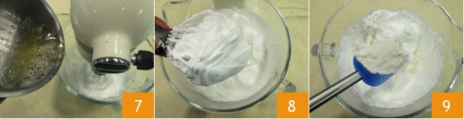pour it slowly into the egg whites, which should be white and frothy 7. Continue to beat the egg whites until the mixture has cooled and the egg whites are whipped to stiff peaks 8. At this point, gently fold the dry ingredients into the egg whites using a spatula with a delicate bottom-to-top movement to incorporate them into the mixture and prevent the egg whites from deflating 9.