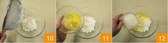 remove the sieve 10 and then add the eggs 11, grated Pecorino 12, and Parmesan.