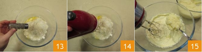 Salt and pepper 13 and start the beaters to create the mixture 14. Gradually, with the beaters still running, add the semolina a spoonful at a time 15