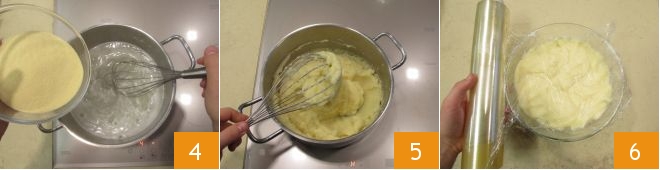 Lower the heat slightly and gradually add the semolina while continuing to stir with a whisk 4. Let it cook over low heat for 2 minutes. The mixture should be thickened but not too much 5. Then pour into a bowl, cover with plastic wrap, and set aside to cool slightly 6.