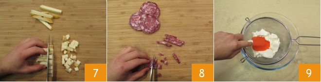 Meanwhile, cut the cheese into 1 cm (about 0.39 inches) cubes (we used scamorza) 7 and the salami, previously peeled, into pieces about half a cm (about 0.2 inches) 8. Sift the ricotta in a large bowl 9