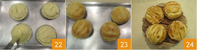 At this point, roll out the second sheet of puff pastry and cut out another 4 disks with the same 4-inch diameter pastry cutter, then use a small knife to make 3 cuts in the center, being careful not to cut through to the edges (19-20). Place the cut-out pastry disk on each tartlet to cover the filling and press along the edges with your fingers to seal it 21.