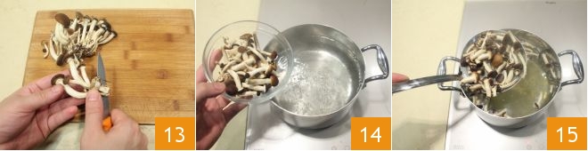 Clean the honey mushrooms by removing any soil residues 13, then blanch them in boiling water for 15 minutes 14, and finally drain them well 15.