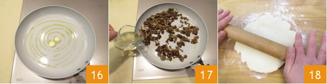 Meanwhile, let a clove of garlic infuse in a pan with a drizzle of oil 16, then remove it and sauté the mushrooms for 2-3 minutes. Then deglaze with white wine 17 and, once evaporated, turn off the heat and let cool completely. Roll out the shortcrust dough on a slightly floured surface to about 0.2 inches thick 18,