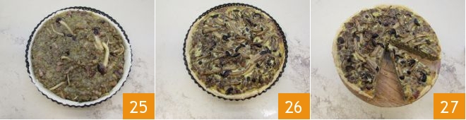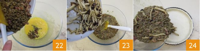 add the lentils 22 and honey mushrooms 23, adjust salt and pepper, and after thoroughly combining, pour the mixture into the tart pan 34.
