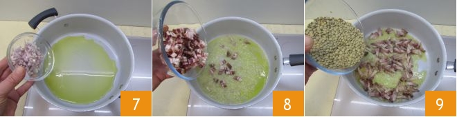 In a large pan, pour some oil and cook the shallot over very low heat 7, letting it sweat for 7-8 minutes, remembering to stir occasionally. Then add the bacon and cook for 3-4 minutes 8. When the base is well cooked, you can add the dried lentils 9
