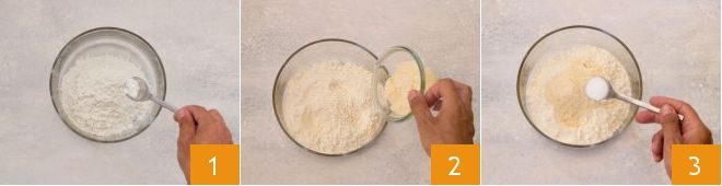 To prepare the savory madeleines with green olives, pour the flour into a bowl, add the baking powder for savory recipes 1, pour in the grated Parmesan 2, and the salt 3.