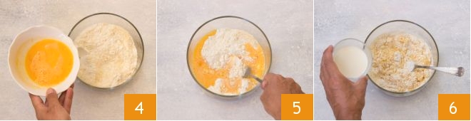 Lightly beat the eggs and add them to the rest 4. Mix, and when the mixture is smooth, add the milk and oil 6.
