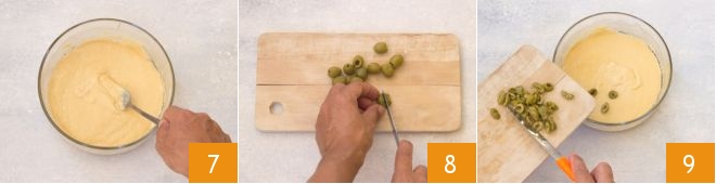 Stir to incorporate the milk 7 and set aside for a moment. Take the olives, slice them into rings 8, then add them to the rest of the mixture 9; stir again.