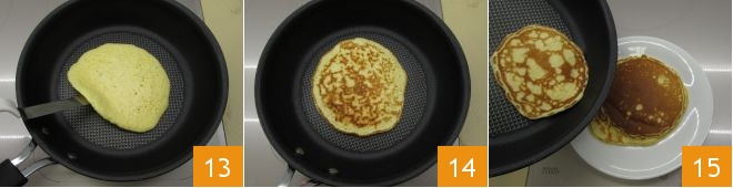 cook for 1 minute on one side 13, then turn the pancake gently with a spatula and cook it for half a minute on the other side, until it is golden on the surface 14. As you cook the pancakes, stack them on a plate 15. With this quantity you will obtain 15 pancakes.