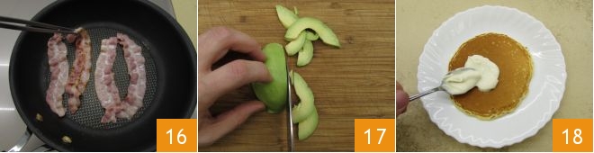 Now take care of the filling: in the same pan you used to cook the pancakes, fry the slices of bacon for a couple of minutes, until they are crispy 16. Now peel the avocado, cut it in half, remove the pit and slice it thinly 17. Everything is ready to assemble the pancakes: place a pancake on a plate, spread a layer of sour cream