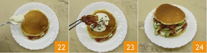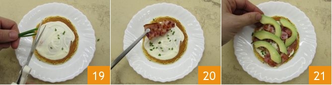 Now place another pancake on top and fill as before with sour cream 22, chives, bacon 23 and avocado. Each serving requires 3 pancakes. Close with another pancake and serve your pancakes with bacon and crème fraîche immediately 34.
