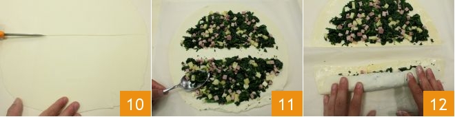 Then in a bowl, place the spinach and add the cheese and cooked ham (7-8), mix and set aside; roll out the puff pastry 9