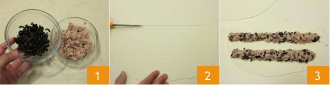 To prepare the pastries, start with the tuna and olive ones: drain the tuna from the preservation oil; then chop it and place it in a small bowl. Add the pitted and chopped black olives 1, then cut the puff pastry disc in half 2 and fill one half with the tuna and olive filling distributed on two slightly spaced strips 3