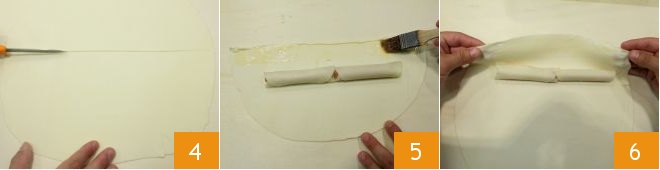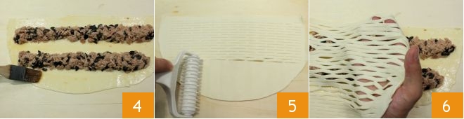brush the uncovered part of the pastry with the egg yolk and milk emulsion 4; use the lattice roller on the other half of the pastry 5, then place it over the half with the filling 6,