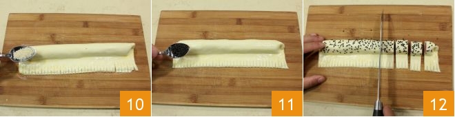 Then brush the surface with the egg yolk and milk emulsion and sprinkle one loaf with white sesame seeds 10 and another with black ones 11; Then proceed to cut them into pieces about 0.8 inches thick: you will get about 10 with black seeds 12.