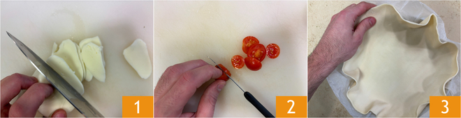 To prepare the savory pie with cherry tomatoes and scamorza, first slice both the scamorza 1 and the cherry tomatoes 2. Place the puff pastry with its parchment paper in a 9.5-inch diameter pan 3.