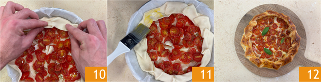 Fold the edges of the puff pastry inwards 10 and brush with beaten egg 11. Bake in a static oven at 400°F for 25-30 minutes, until the pastry is golden and crispy. Finally, garnish with a few basil leaves. Your savory pie with cherry tomatoes and scamorza is ready to be enjoyed 12!