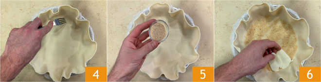 Prick the bottom with a fork so it won't puff up during baking 4. Sprinkle the base with breadcrumbs 5, then add the scamorza 6.