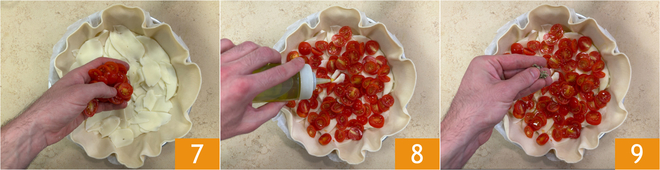 Distribute the cherry tomatoes 7, then season with oil 8, salt, pepper, and oregano 9.