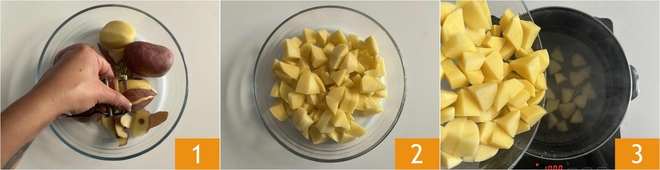 To prepare the savory potato and bacon pie, start with the potatoes: wash them, peel them 1, and cut them into cubes 2. Bring a pot of salted water to a boil and cook the potatoes for 2-3 minutes 3.