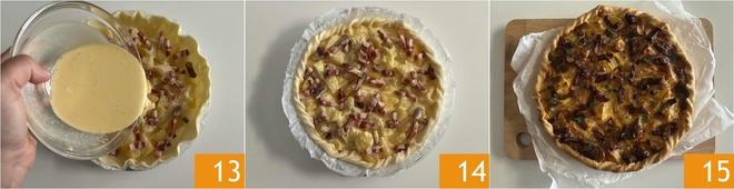 Spread the cooled potatoes 10, grated cheese 11, and bacon 12 over the base.