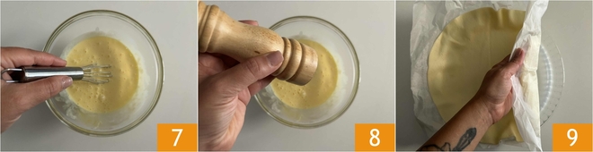 Beat the mixture with a whisk 7, then season with salt and pepper 8 and mix again. At this point, unroll the puff pastry and place it with its parchment paper in a mold with a diameter of 11 inches 9.