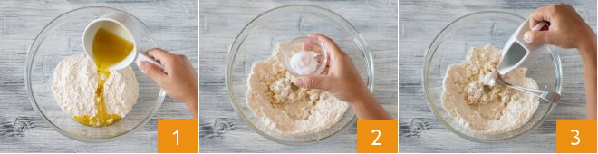 To make the rustic pie with potatoes, mushrooms, and scamorza, pour the flour, olive oil 1, salt 2, and water 3 into a bowl.