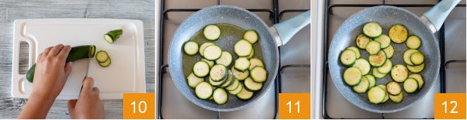 Wash and slice the zucchinis 10, heat another drizzle of olive oil in a different pan, add the zucchinis 11 and cook them for about ten minutes 12.