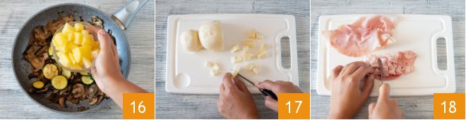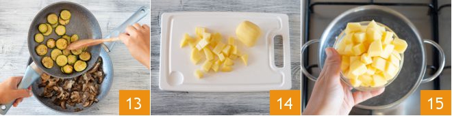 Now incorporate the cooked zucchinis with the mushrooms 13 and set aside. Peel and cut the potatoes into cubes of about 3/4 inch 14, blanch them in salted water for about 6 minutes 15.