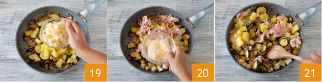 After cooking, drain the potatoes and add them to the rest of the filling 16. Finish by dicing the scamorza 17 and cutting the cooked ham into strips 18.