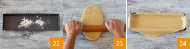 Butter and flour a 13.75 x 4.25 in tart pan 22. Take your dough ball and roll it out with a rolling pin 23 to a thickness of about 1/5 inch. Lay the dough sheet on the pan 34 and press lightly to make it adhere to the bottom and edges.